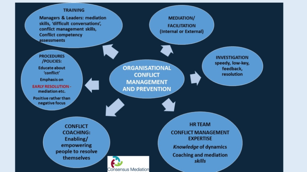This includes on-site, hand – in – hand assistance, and adequate training – in mediation, conflict coaching and possessing strong theoretical knowledge on the complexities of organizational conflict skills.